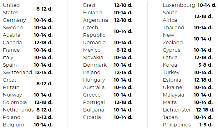 We usually take about 1–2 business days to process your order. After that, you can expect the following delivery times, depending on your country: